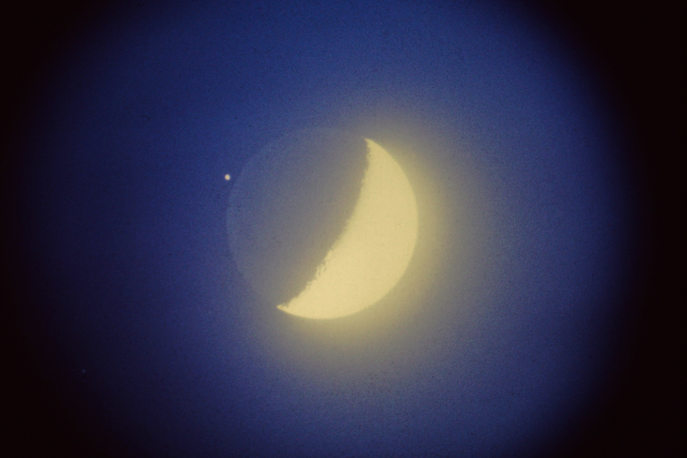 Immagine dell’occultazione della stella Aldebaran del Toro da parte del nostro satellite. l’inizio dell’occultazione avveniva nella parte di Luna in luce cinerea. Immagine ripresa con rifrattore Meade 90mm f/11 su pellicola blu per luce artificiale data la presenza di nubi.